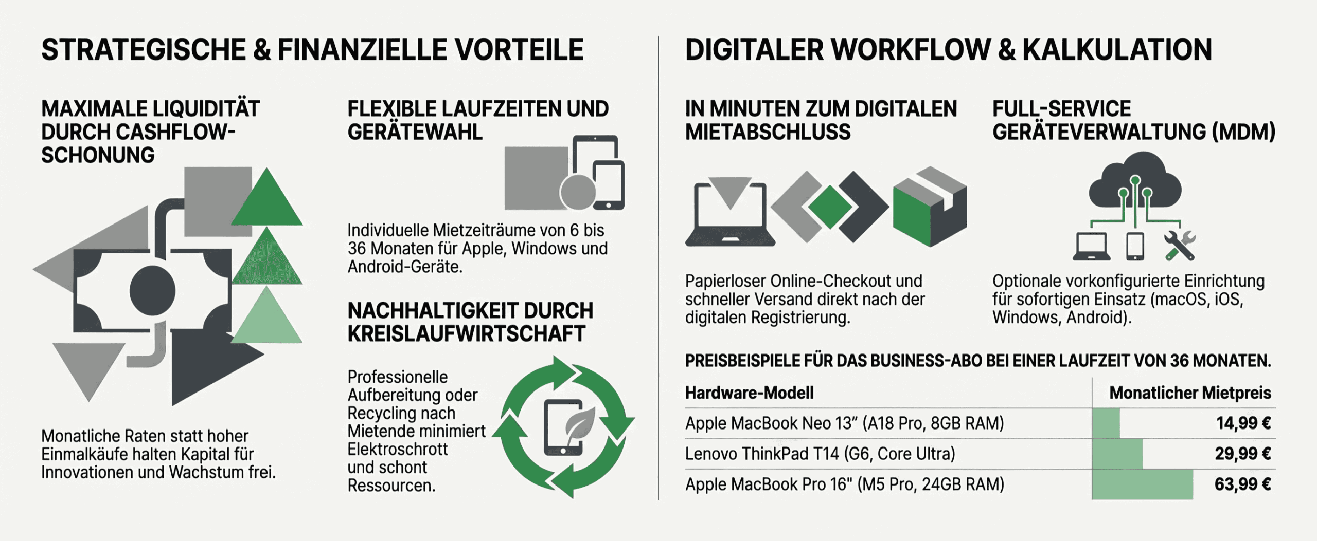 Die Eigenfinanzierung von Hardware wie MacBooks, Windows-Laptops oder Smartphones verursacht oft hohe Rechnungen und gebundenes Kapital. Wenn ihr eure IT-Ausrüstung mietet, behaltet ihr die volle Kontrolle über die monatlichen Kosten und schont euren Cashflow.